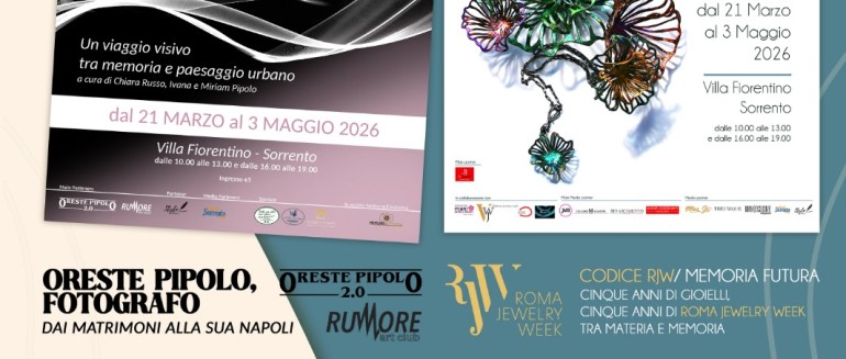 La rassegna "Memoria e Materia" anima la primavera di Sorrento presso la storica Villa Fiorentino, dal 21 marzo al 3 maggio 2026. L'evento propone un affascinante dialogo tra due diverse forme d'arte: da una parte l'esposizione fotografica dedicata a Oreste Pipolo, celebre fotografo dei matrimoni e della cultura napoletana; dall'altra la mostra di gioielli contemporanei "Codice RJW / Memoria Futura", che celebra i primi cinque anni della Roma Jewelry Week. L'ingresso alla doppia esposizione ha un costo di 5€.